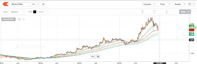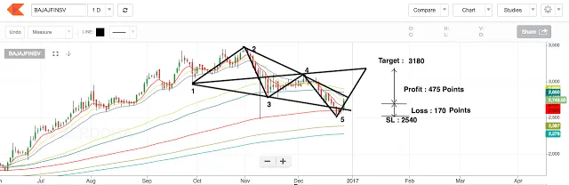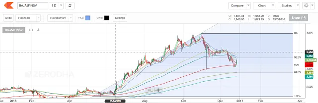 2. If we consider the previous swing of 1725 – 3480 and draw the Fibonacci retracements, we can observe that the price has formed a bullish harami followed by a 4.8% uptick today (27-12-2016) at the 50% retracement level. Any pullback towards the 50% retracement level is a healthy pullback and has a high possibility to result in an upward rally. The Fibonacci extensions project price at 4178 and 4540 (52 % and 65 % respectively from cmp of 2743)