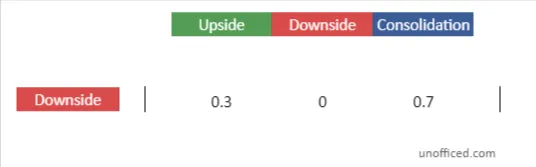 This row corresponds to the ‘Downside’ state, and each element in this row now represents the probability of transitioning from the ‘Downside’ state to each of the three possible states (‘Upside’, ‘Downside’, ‘Consolidation’) in the next time step.