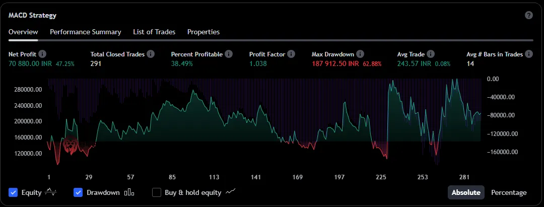 The 1-day timeframe backtest of the MACD crossover strategy on Nifty Futures shows that out of 291 total closed trades, the strategy produced a net profit of 70,880.00 INR, which is a 47.25% return on the initial amount.