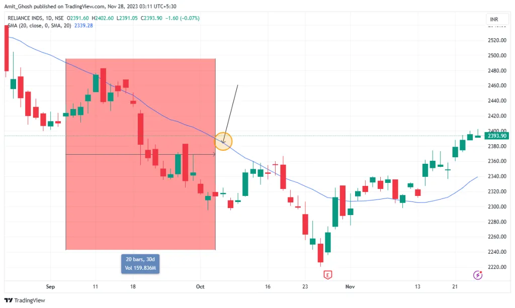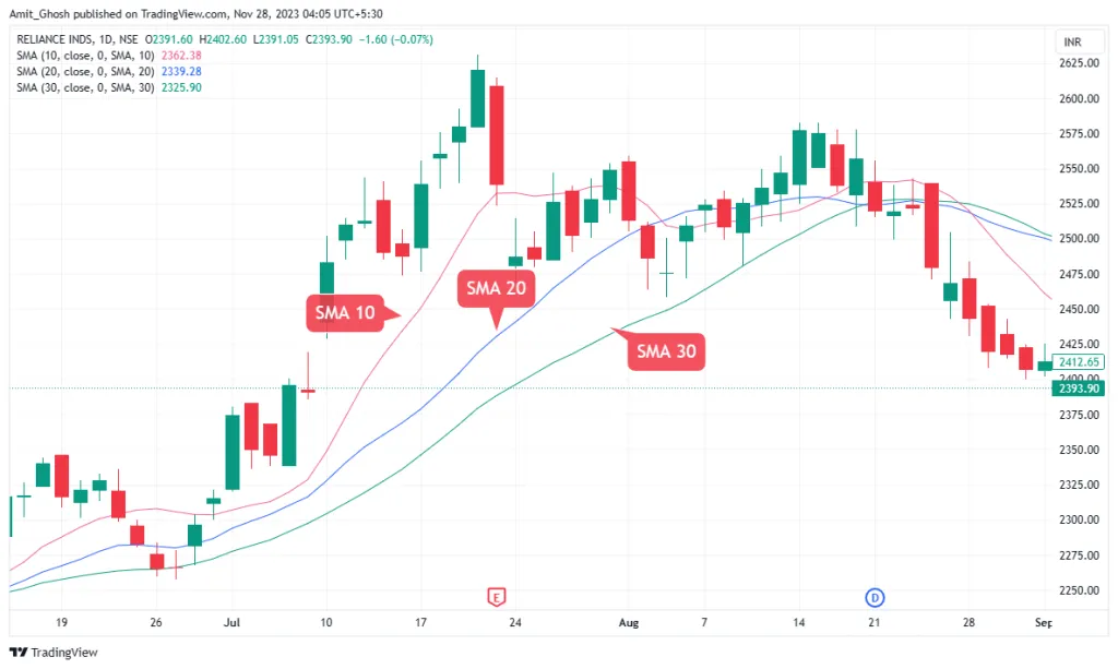 So, for a 20-day moving average, the last 20 closing prices for each day are taken and added together, then divided by 20, giving the average closing price over the last 20 days. This price is then plotted on the chart.