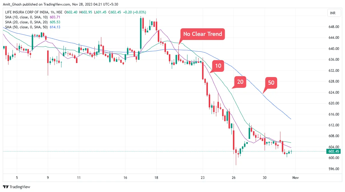 When there is no prevailing trend, the moving averages are intertwined, as you can see at the beginning of the chart. As the market enters into a downtrend, the moving averages cross over and align in order of the periods.