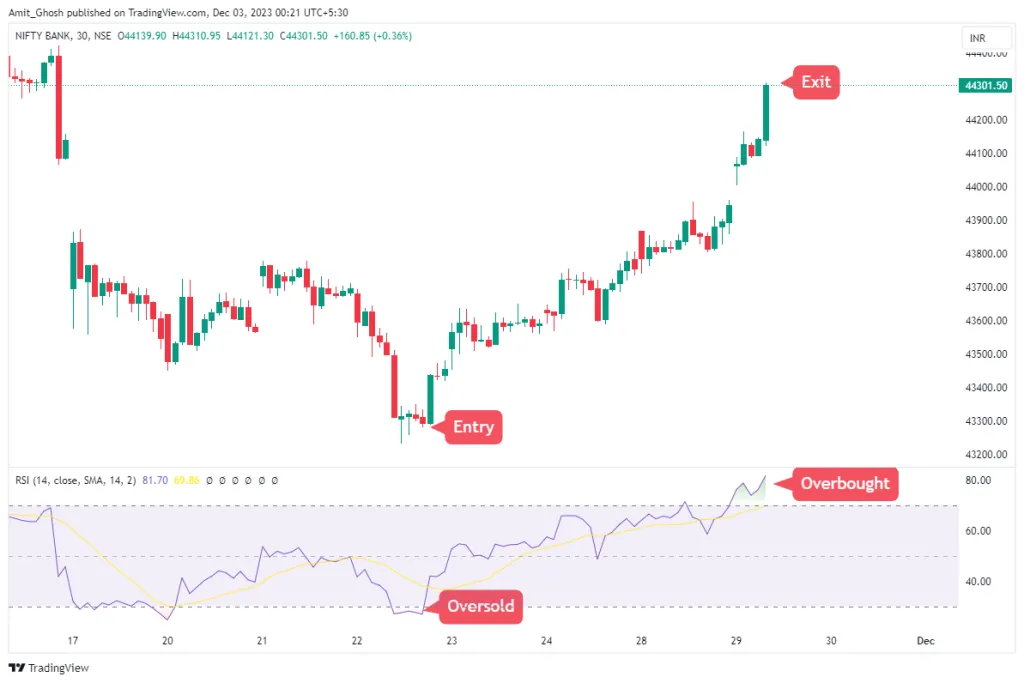 For example, if you were long and price was heading up strongly and the RSI was giving an overbought reading above 70, you may want to exit or reduce your position size.