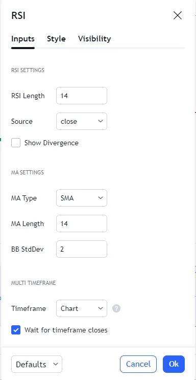 You have the choice of either making the indicator more or less sensitive to changes in price. The default setting for the RSI indicator on Tradingview is set to 14 periods.