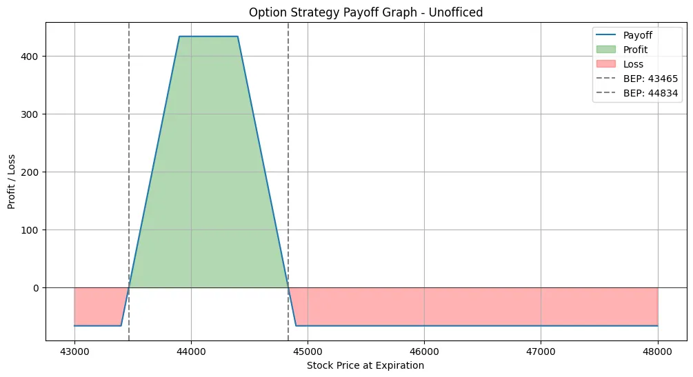 Lower Breakeven: Strike price of the lower sold put (43900) plus the net debit. 43900 + 66 = 43966.