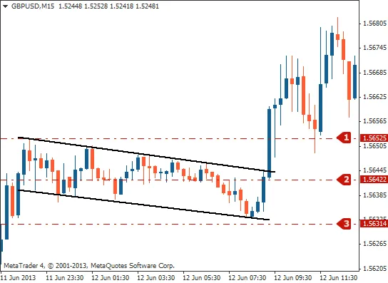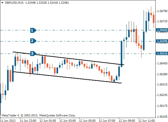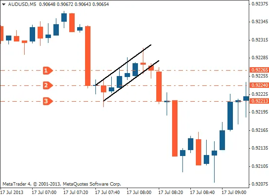 A bullish flag is highlighted. Which of the three marked entry levels is the most suitable, according to the lesson?