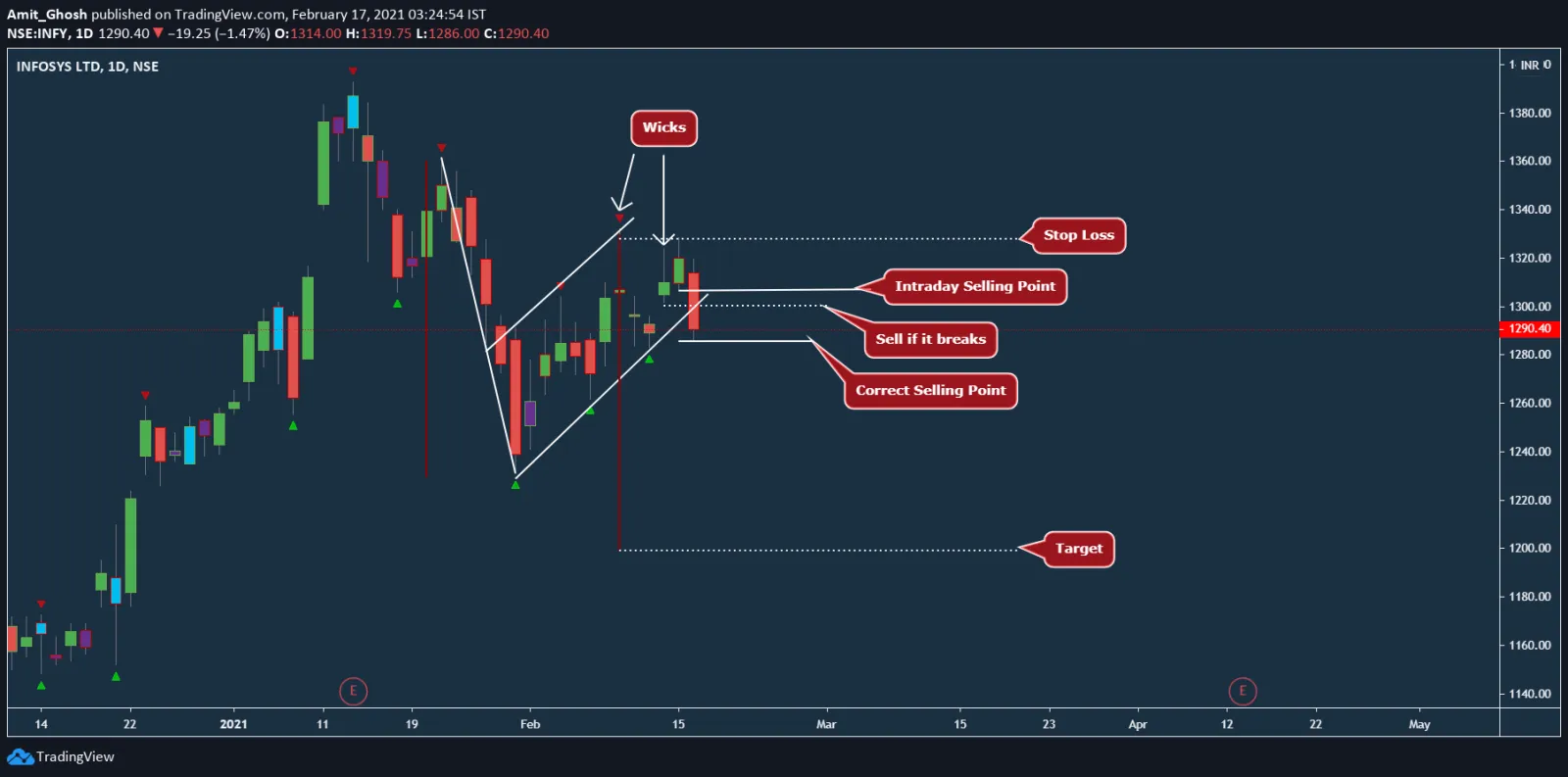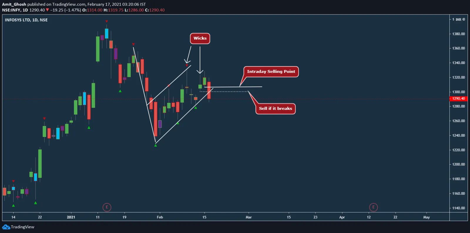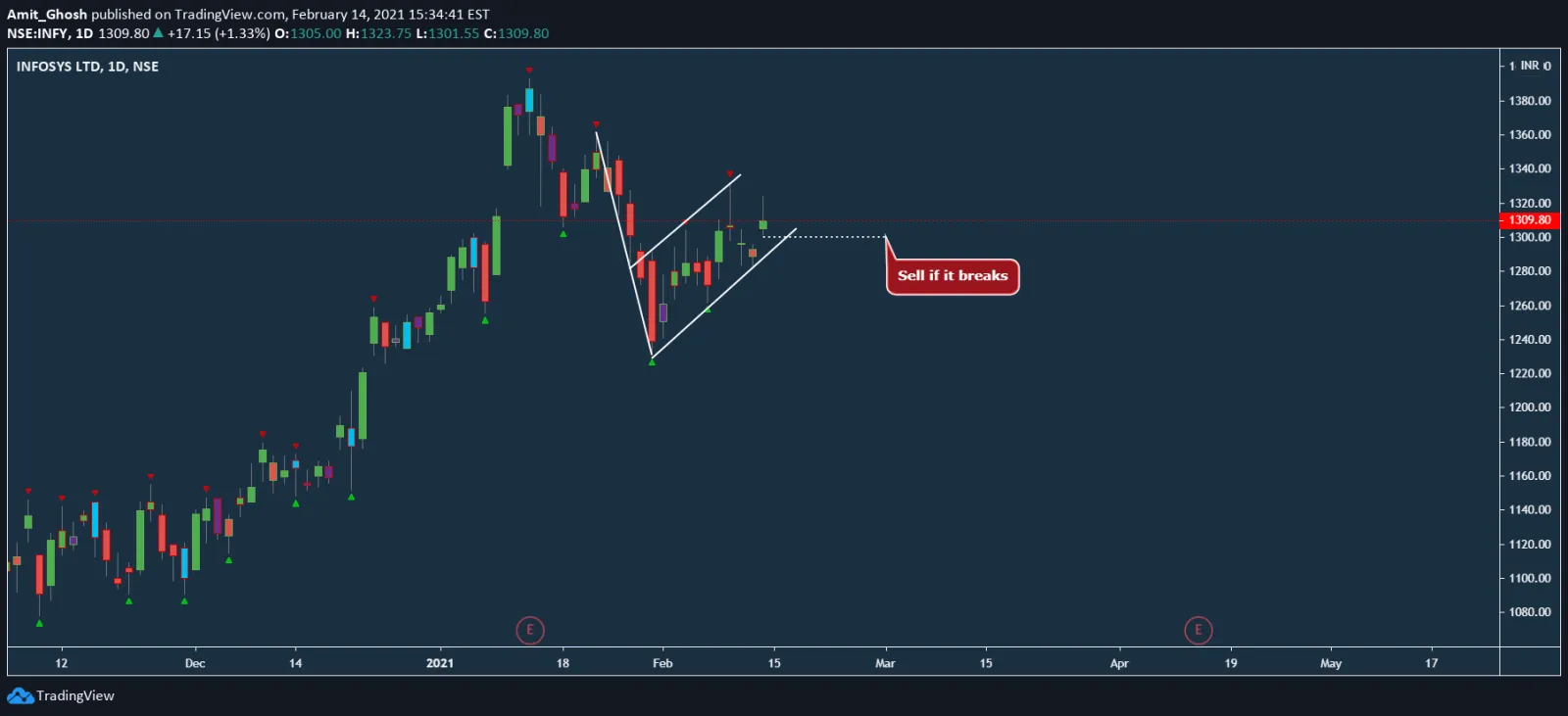 But, Our current bet is on the “price action” (read, high movement) that is created by the flag’s lower trendline break. As the trade is not confirmed and it is a chart of D frame, It is preferred to exit in Intraday itself!