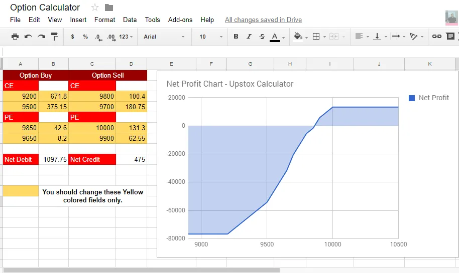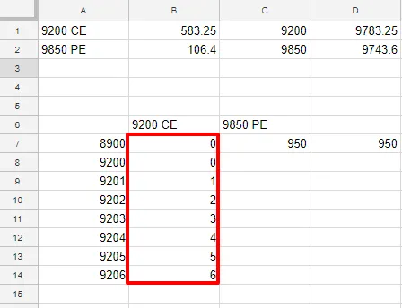 Now let’s do it for the whole range of 8900-10000. Keep an eye on Google Sheet. Actually it is not “net profit” but “the combined current value of 9200 CE buy and 9850 PE”.