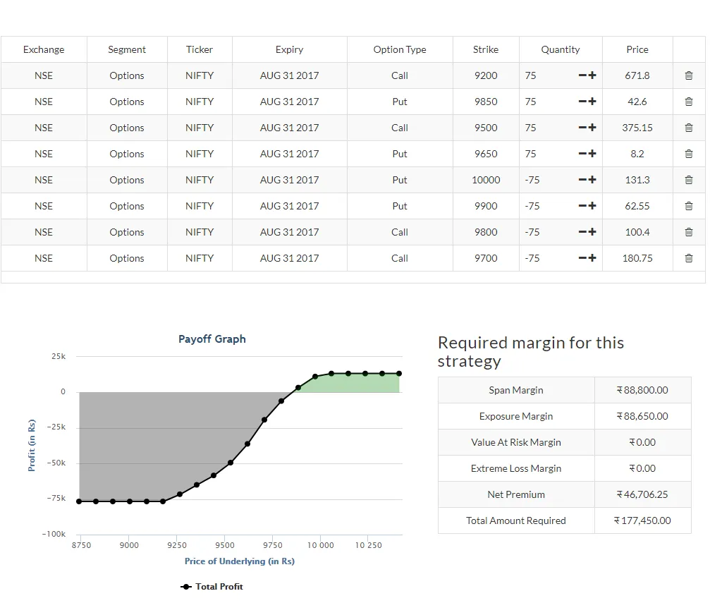 A. NIFTY 9200 CE August is at 583.25 Hence, the breakeven point is 9200 + 583.25 = 9783.25 NIFTY 9850 PE August is at 106.4 Hence, breakeven point is 9850 – 106.4 = 9743.6 We are talking the case of the combined setup of (NIFTY 9200 CE August + NIFTY 9850 PE August). In that case we make profit if 9889.65 > CMP < 9160.35