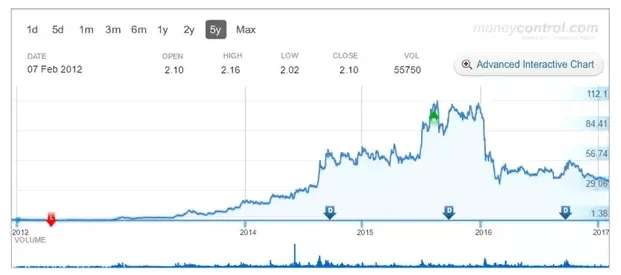 If you see the 5-year chart, this stock was trading at Rs. 2 in Feb 2012, rose to hit almost Rs. 115 (a return of almost 57 times), only to crash again and trade at Rs. 38 (for a return of 19 times).