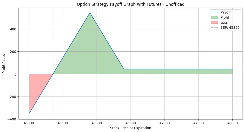 Maximum Loss (to the upside): Above the 46400 strike price, losses on the short call are offset by gains on the long call, minus the net credit received.