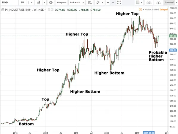 1. The long-term trend of the stock has been up. It has been making constant Higher Tops and Higher Bottoms since inception. This is an indication that after brief periods of down move, bulls find value in this script and they buy those dips.