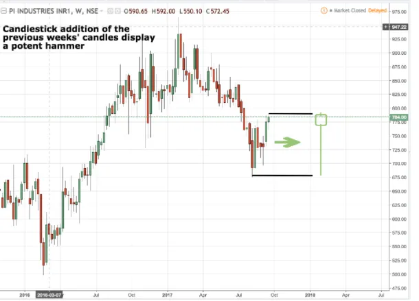 4. On further analyzing the weekly candles at the current higher bottom location, we observe that there is a strong presence of smart money/bulls / informed and learned investors. The candles do appear to be somewhat chaotic, however, on close observation post candlestick addition, we can see that the previous weeks’ candles are equivalent to a hammer candlestick with a sizable tail. This alone indicates that stubborn bulls reside at this level and they will bring demand into the script and take its price up.