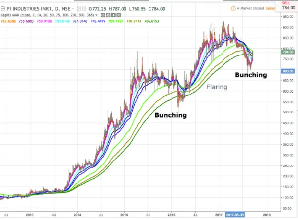 5. A moving average rainbow (MAR) analysis paints a clear picture about the dynamic support that the script entertains in the long term. The script has a tendency to dip down to such an extent that the short, mid and long-term EMAs bunch and this is where the accumulation of the smart money occurs. The bunching phase is followed by a flaring phase where price shoots up to form a Higher High. Currently, we are witnessing a bunching phase which will lead to a speed & power breakout thus setting the pace for an up move.