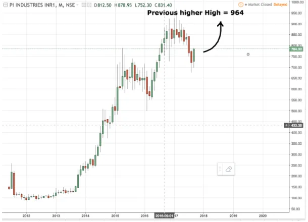 1. Since the script is in a fierce uptrend, the first target that we can aim for is the previous higher high of 964 which is 23% of the current price of 784.