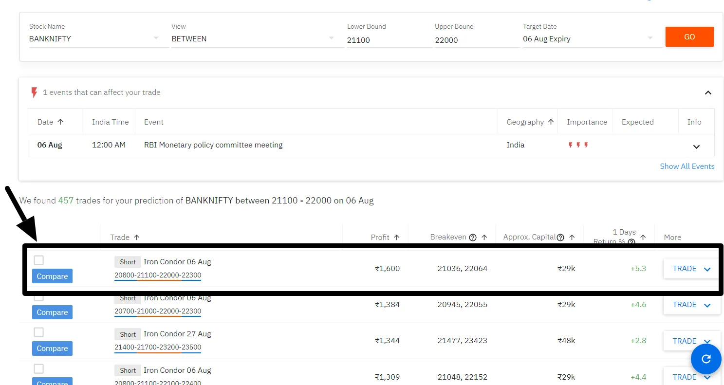 You will not only get multiple options to evaluate different metrics of an Iron Condor, You can also see all minor details like – Greeks, POP in a snap.